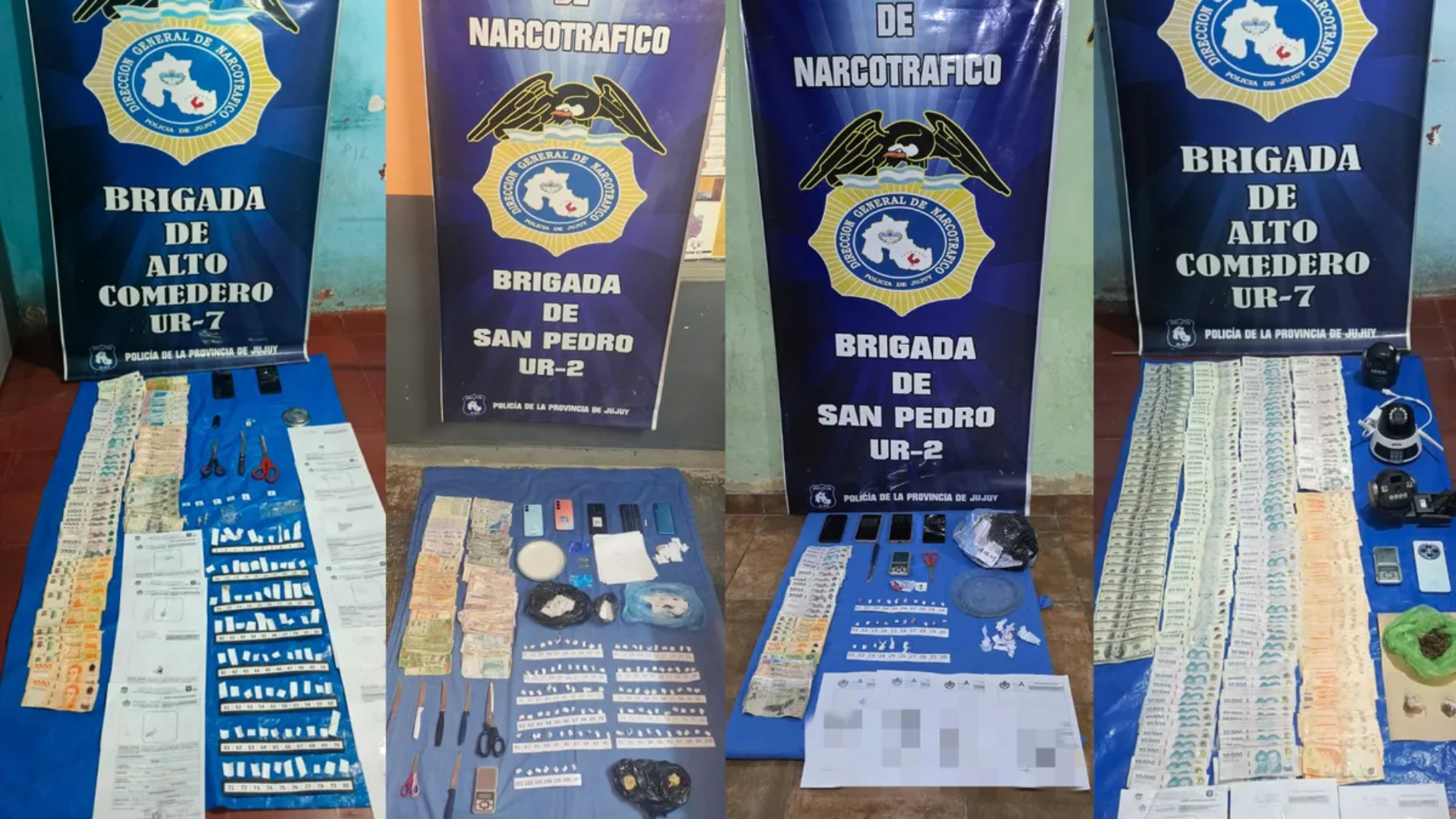 En tanto la Brigada de San Pedro de Jujuy desmanteló bunkers en los barrios San Miguel y Loteo Arrayanal, logrando incautar más de 130 envoltorios de pasta base, cocaína compactada y más de un millón doscientos mil pesos en efectivo, con un total de cinco personas detenidas.
