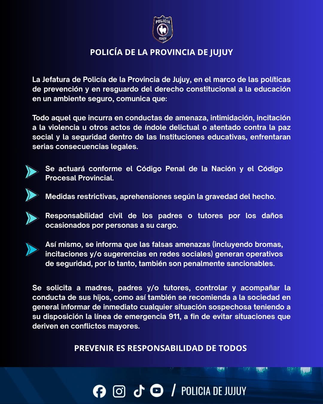 Luego de una ola de amenazas de tiroteo en establecimientos educativos de todo el país y especialmente en Jujuy, la Policía de la provincia emitió un comunicado advirtiendo que padres o tutores serán responsables por las acciones de los menores.