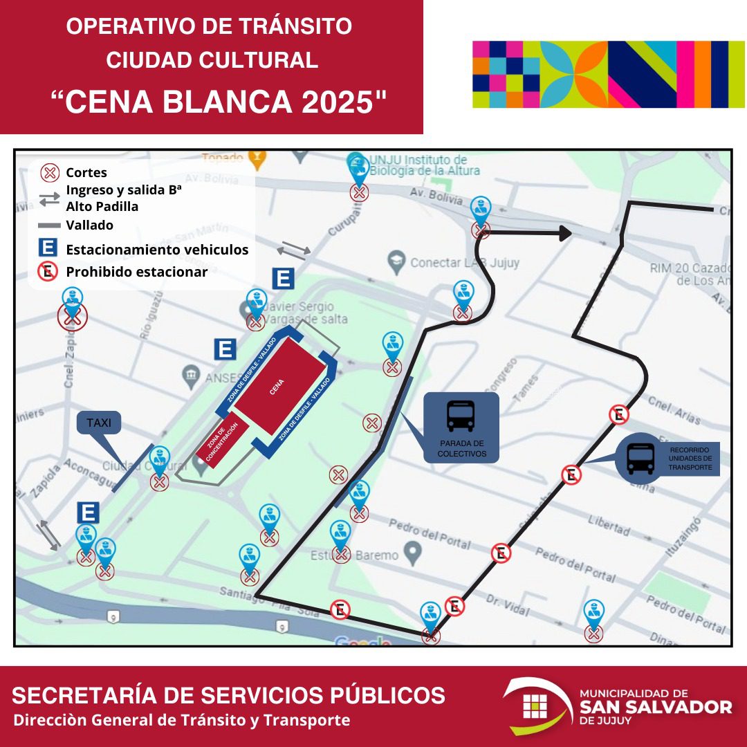 La Dirección de Tránsito y Transporte, dependiente de la Secretaría de Servicios Públicos, informó a la comunidad que, con motivo de la tradicional Cena Blanca que tendrá lugar este viernes 5 en Ciudad Cultural, se implementará un importante operativo de ordenamiento vial. Las medidas comenzarán a regir a partir de las 18 horas, por lo que se solicita a los conductores circular con precaución y respetar las indicaciones del personal apostado en el lugar.