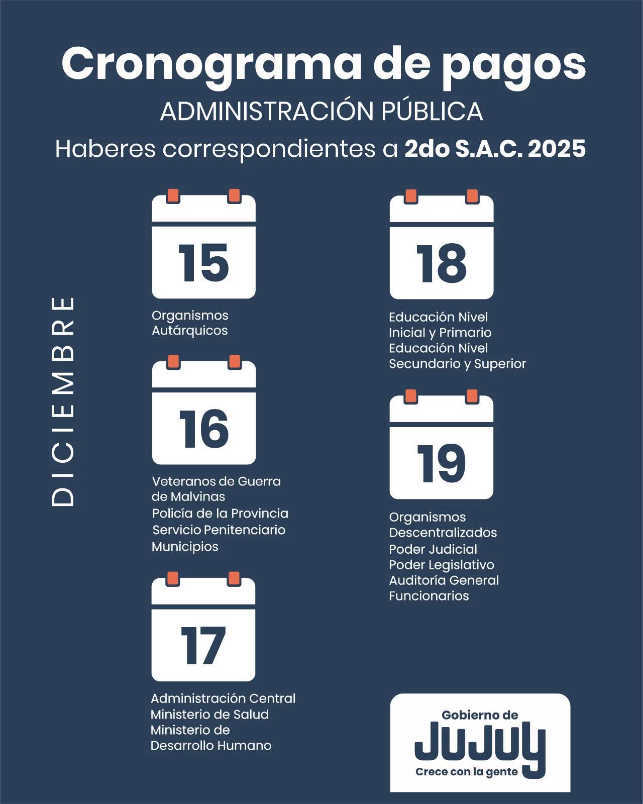 El Gobierno de Jujuy dió a conocer el cronograma de pago del Aguinaldo para la Administración Pública, que se realizará entre el 15 y el 19 de diciembre.