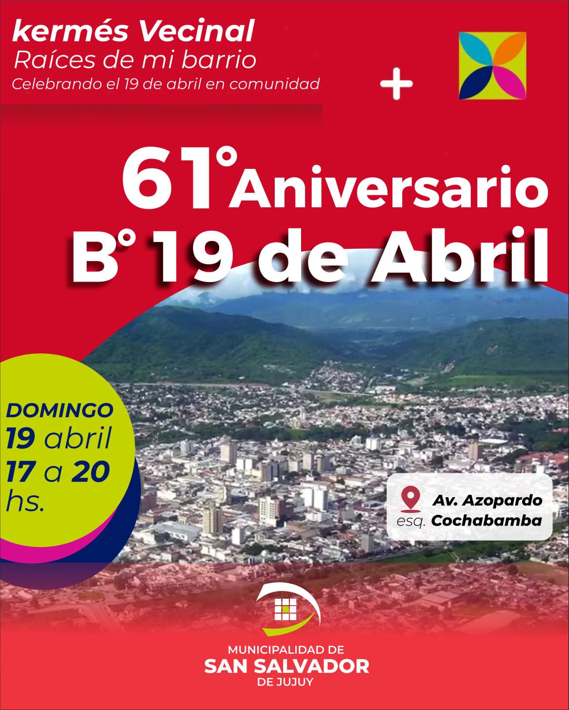 En el marco de un nuevo aniversario del barrio 19 de Abril, vecinos y el municipio organizan la Kermés Vecinal “Raíces de mi barrio”, una propuesta pensada para fortalecer la integración y el sentido de pertenencia en la comunidad. La actividad se llevará a cabo el domingo 19 de abril, de 17 a 20 horas, en la intersección de avenida Azopardo y Cochabamba.