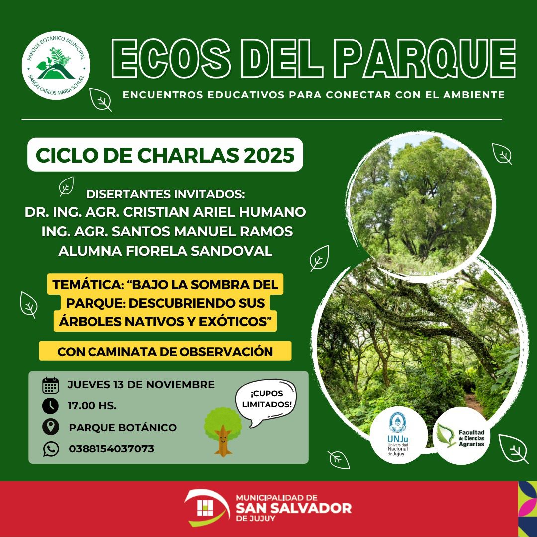 Bajo el título “Bajo la sombra del Parque: descubriendo sus árboles nativos y exóticos”, la actividad contará con la participación de especialistas de la Facultad de Ciencias Agrarias de la Universidad Nacional de Jujuy, quienes ofrecerán una mirada científica sobre la ubicación fitogeográfica del parque, las características ecológicas de la Selva Montana de Yungas y la composición florística que la define.