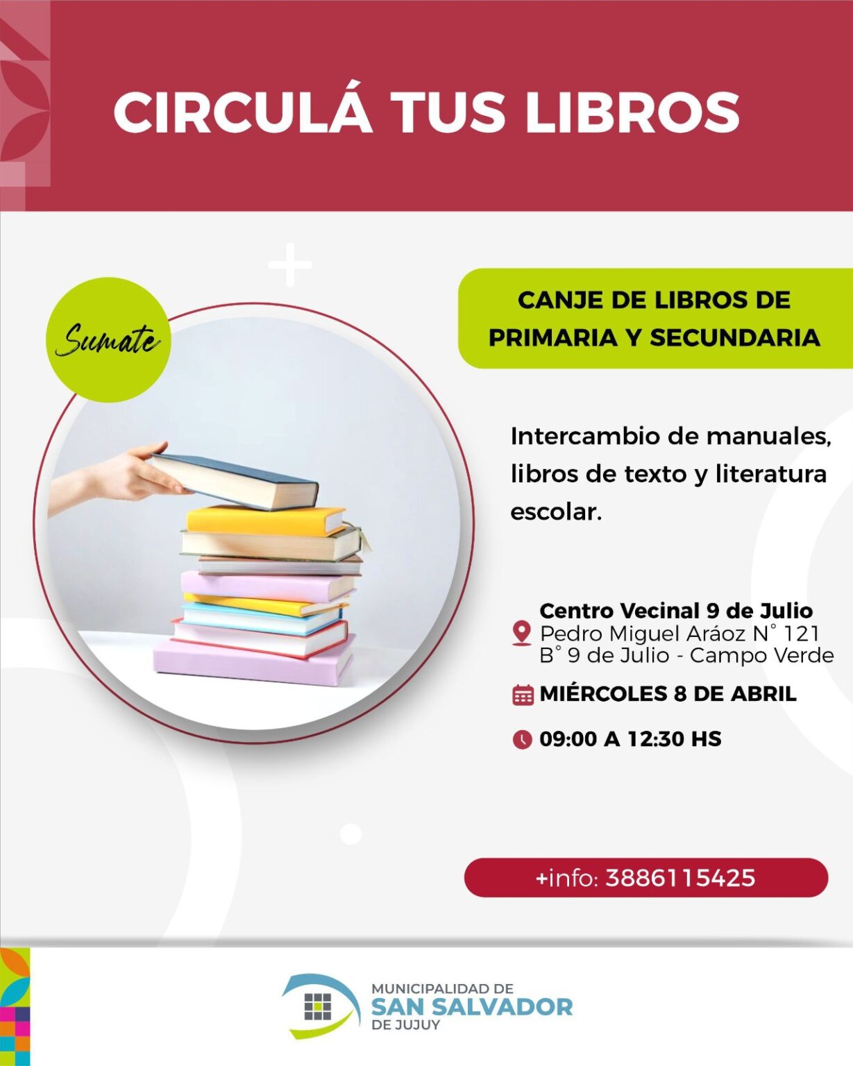 La Municipalidad de San Salvador de Jujuy invita a la comunidad a participar de una nueva edición de “Circulá tus libros”, una iniciativa solidaria que promueve el intercambio de manuales, libros de texto y literatura escolar para estudiantes de nivel primario y secundario. Las jornadas se desarrollarán durante abril en diferentes puntos de la ciudad.