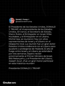 En ese marco, Trump señaló que Estados Unidos colaborará con el Líbano para fortalecer su capacidad de defensa frente a Hezbollah, en un contexto de tensiones persistentes en la región.
