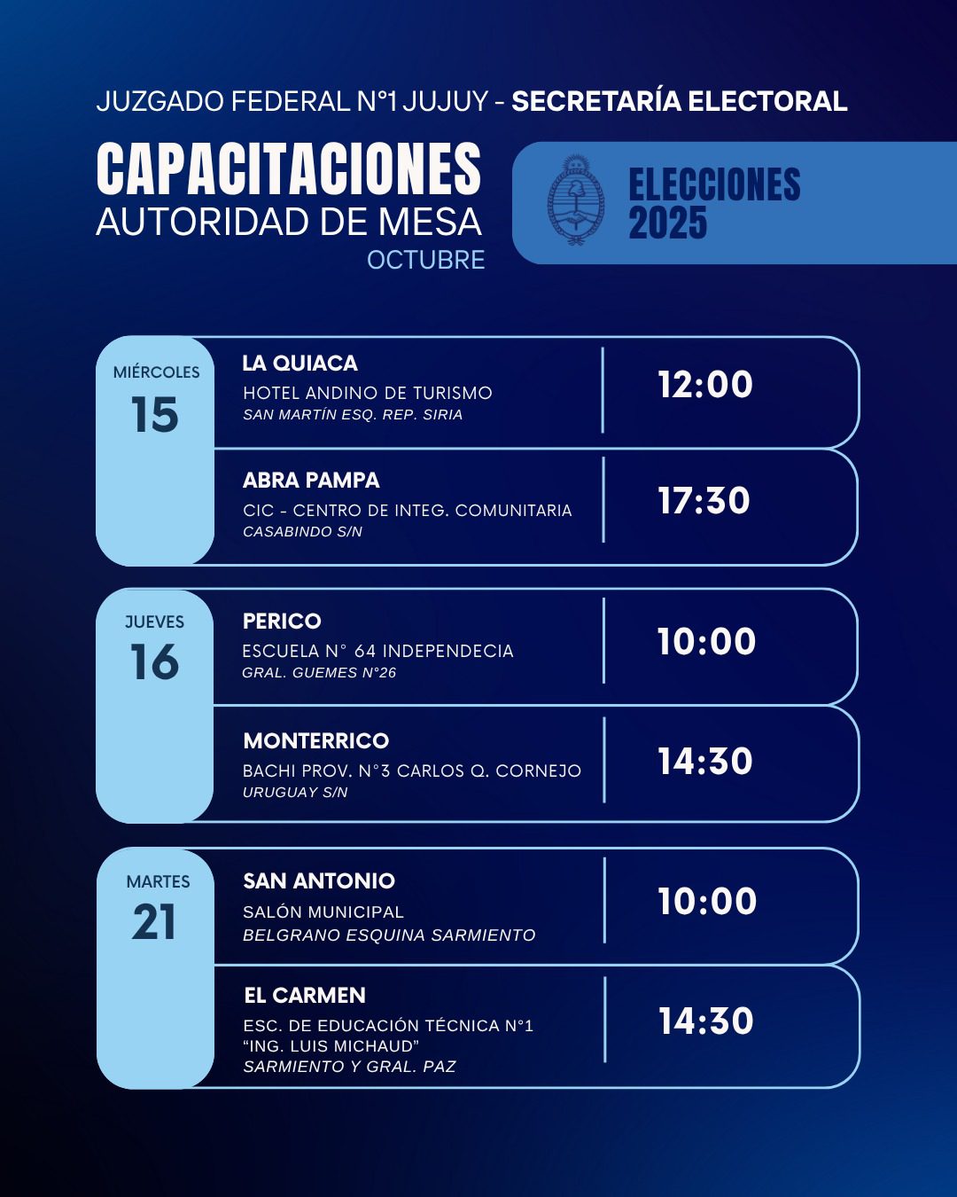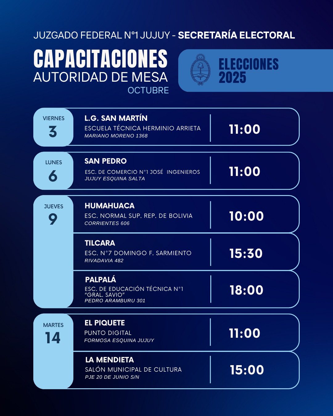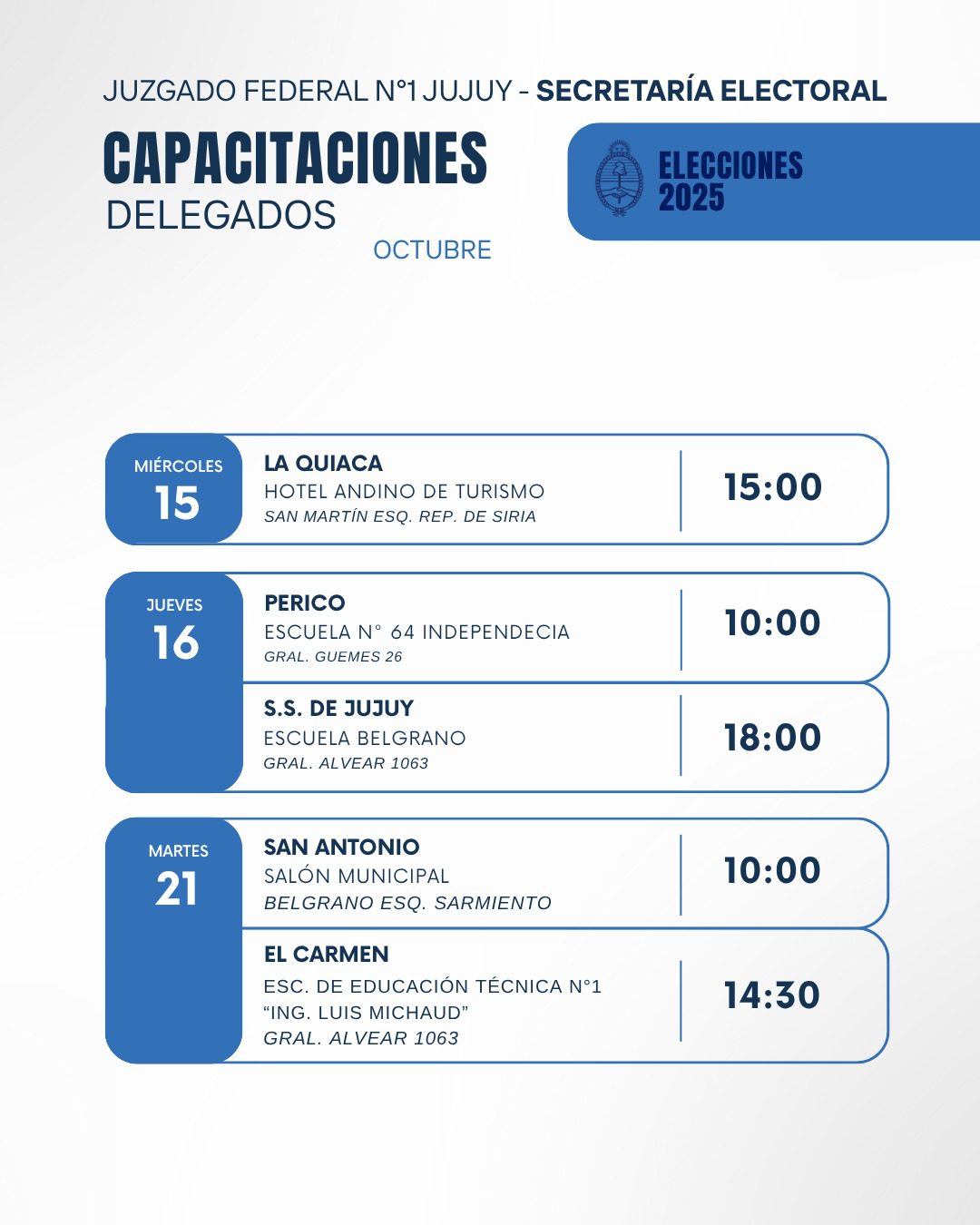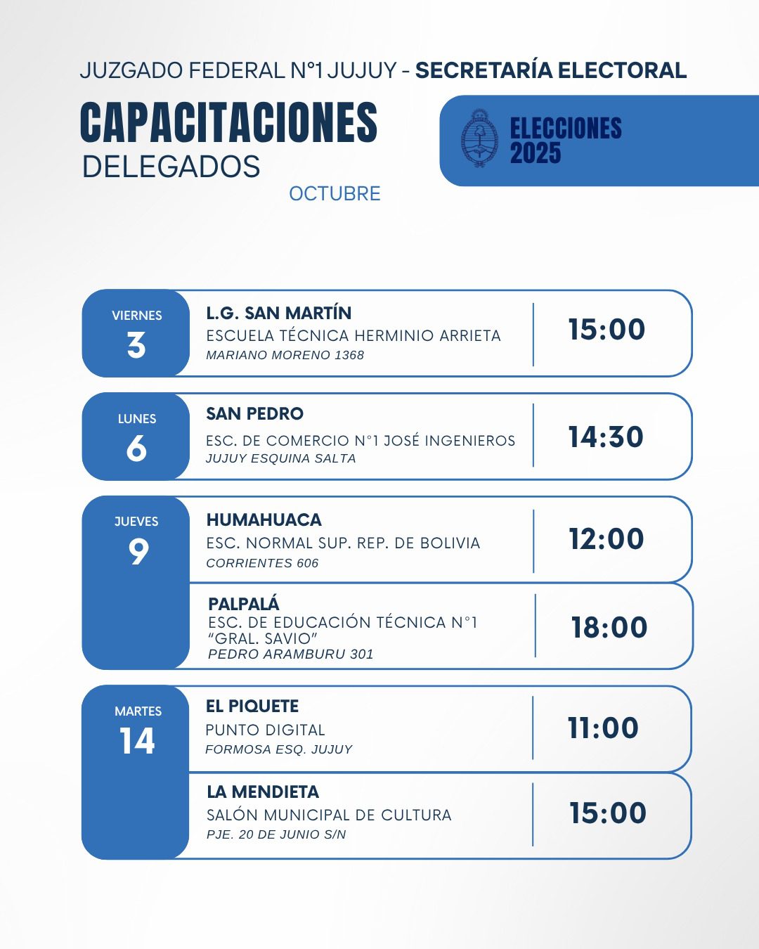 Desde la Secretaría Electoral del Juzgado Federal N°1 de Jujuy informaron el cronograma de capacitaciones para las autoridades de mesa, delegados judiciales y tecnológicos que participarán de las elecciones nacionales del próximo 26 de octubre.