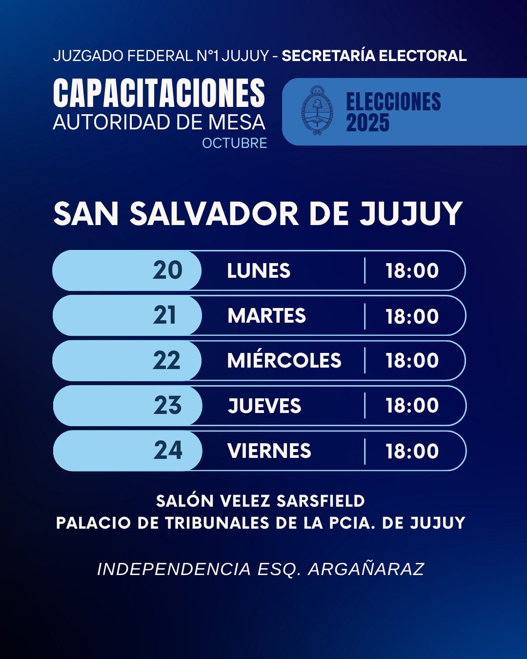 - Del lunes 20 al viernes 24 – San Salvador de Jujuy, Salón Vélez Sarsfield (Tribunales), 18:00