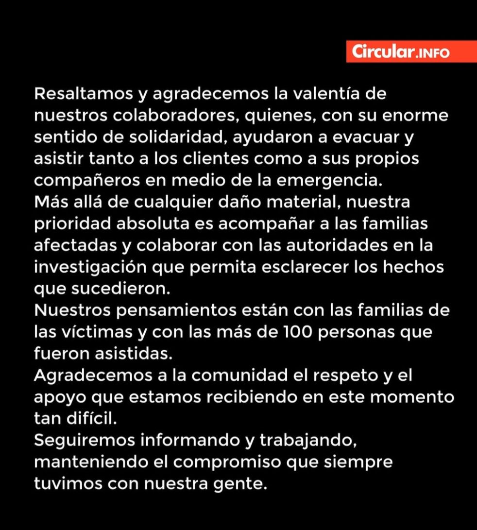 En la redacción, la empresa afirma su profundo dolor por lo sucedido, ofrece sus condolencias a las familias de los fallecidos y acompaña a su vez, a los más de 100 clientes afectados qué se encuentran en diferentes hospitales de la provincia.