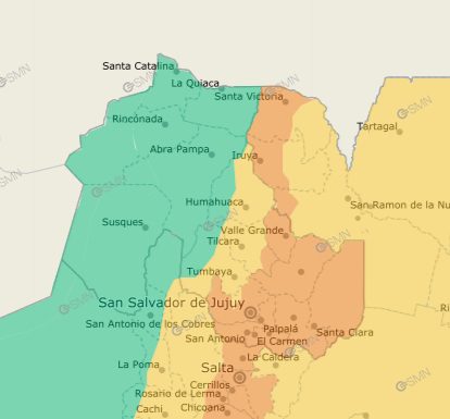 El alerta amarillo alcanza a la Zona montañosa de Doctor Manuel Belgrano – Zona montañosa de Humahuaca – Zona montañosa de Tilcara y Zona montañosa de Tumbaya, mientras que el alerta naranja afectará a El Carmen – Ledesma – Palpalá – San Antonio – San Pedro – Santa Bárbara – Valle Grande – Zona baja de Doctor Manuel Belgrano y Zona baja de Tilcara.