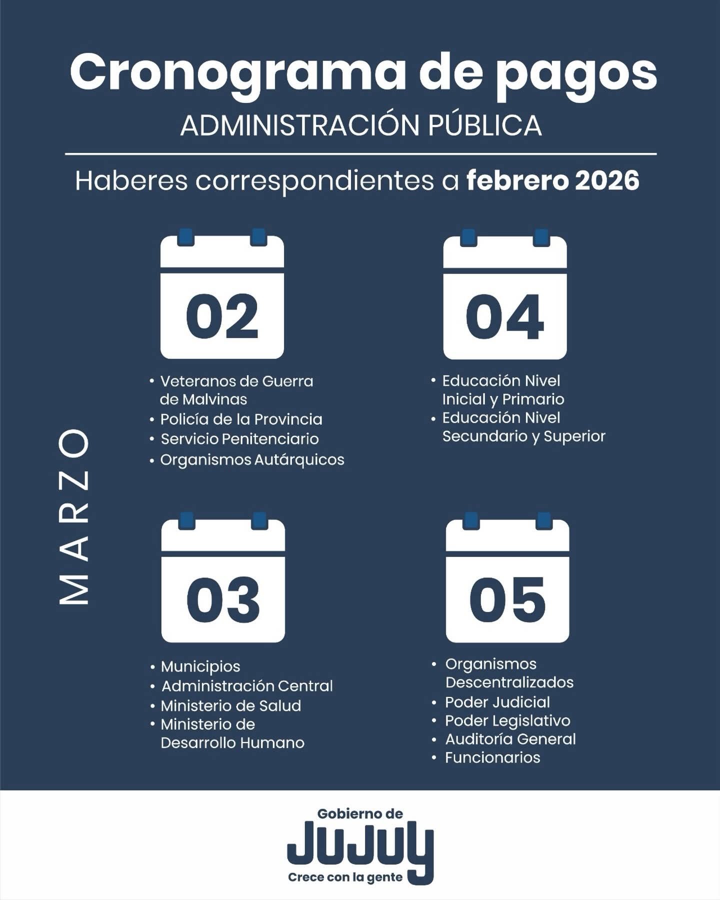 El Gobierno de Jujuy anunció el cronograma de pagos de los haberes de febrero para la administración pública. Comenzará el lunes 2 y se extenderá hasta el 5 de marzo.
