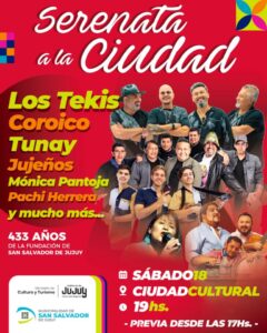 En el marco del 433° aniversario de San Salvador de Jujuy, este 18 de abril se llevará a cabo una nueva edición de la tradicional Serenata a la Ciudad en Ciudad Cultural. El evento será con entrada libre y gratuita y está pensado como uno de los principales festejos del calendario local.