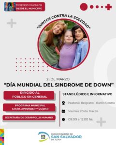 En el marco del Día Mundial del Síndrome de Down, que se conmemora el 21 de marzo, la Municipalidad de San Salvador de Jujuy realizará una jornada de concientización abierta a la comunidad, con el objetivo de informar sobre esta condición genética y promover la inclusión.