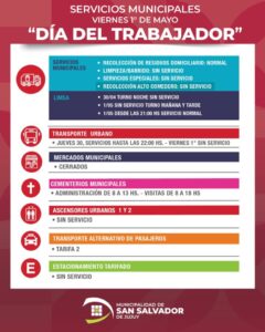La Municipalidad de San Salvador de Jujuy informó el esquema de prestación de los distintos servicios públicos durante el feriado nacional del 1° de mayo, en el marco del Día Internacional del Trabajador.