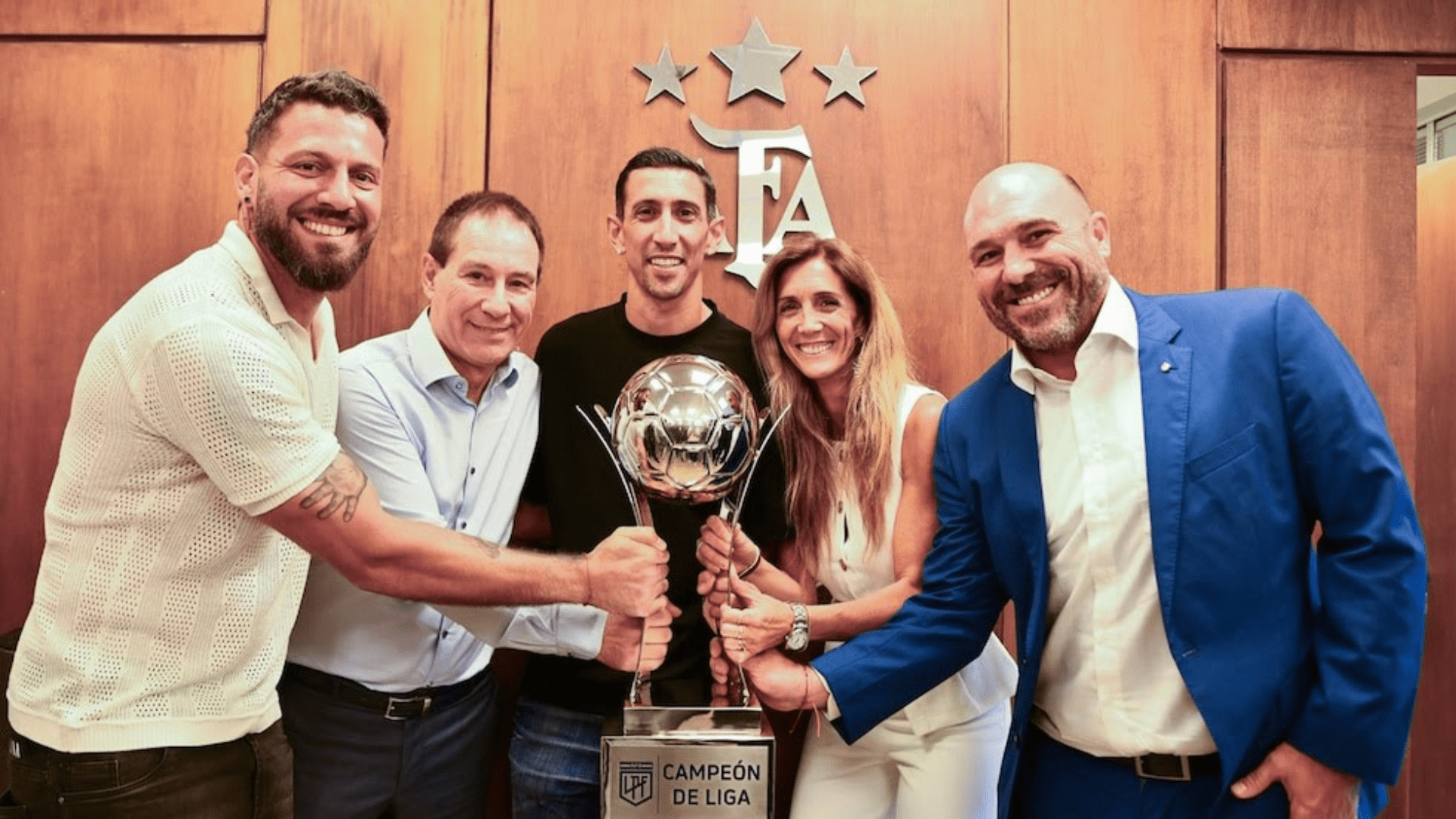 Por otro lado, el arquero Jorge Broun lució el nuevo trofeo, acompañado también del entrenador Ariel Holan y de Ángel Di María.
